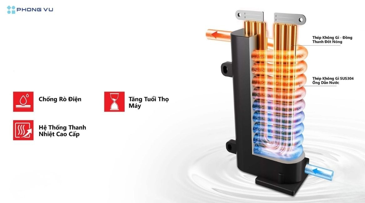 Máy được trang bị hệ thống điện nước tách biệt, vỏ chống cháy V0 và chuẩn kháng nước IP25, đảm bảo an toàn và độ bền lâu dài. Do không có bơm trợ lực, hiệu quả sử dụng phụ thuộc nhiều vào áp lực nước đầu vào. Máy phù hợp với nhà phố hoặc căn hộ có nguồn nước ổn định, ưu tiên sự an toàn và thao tác đơn giản.